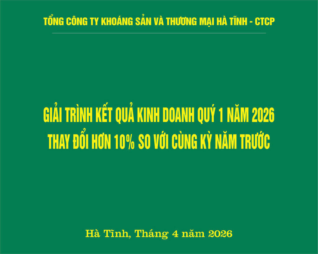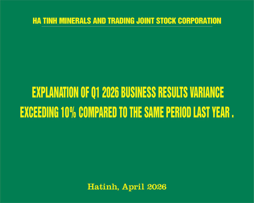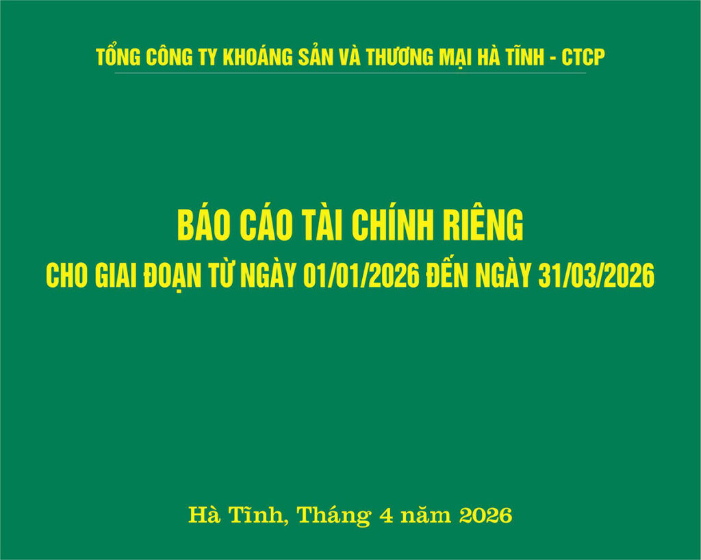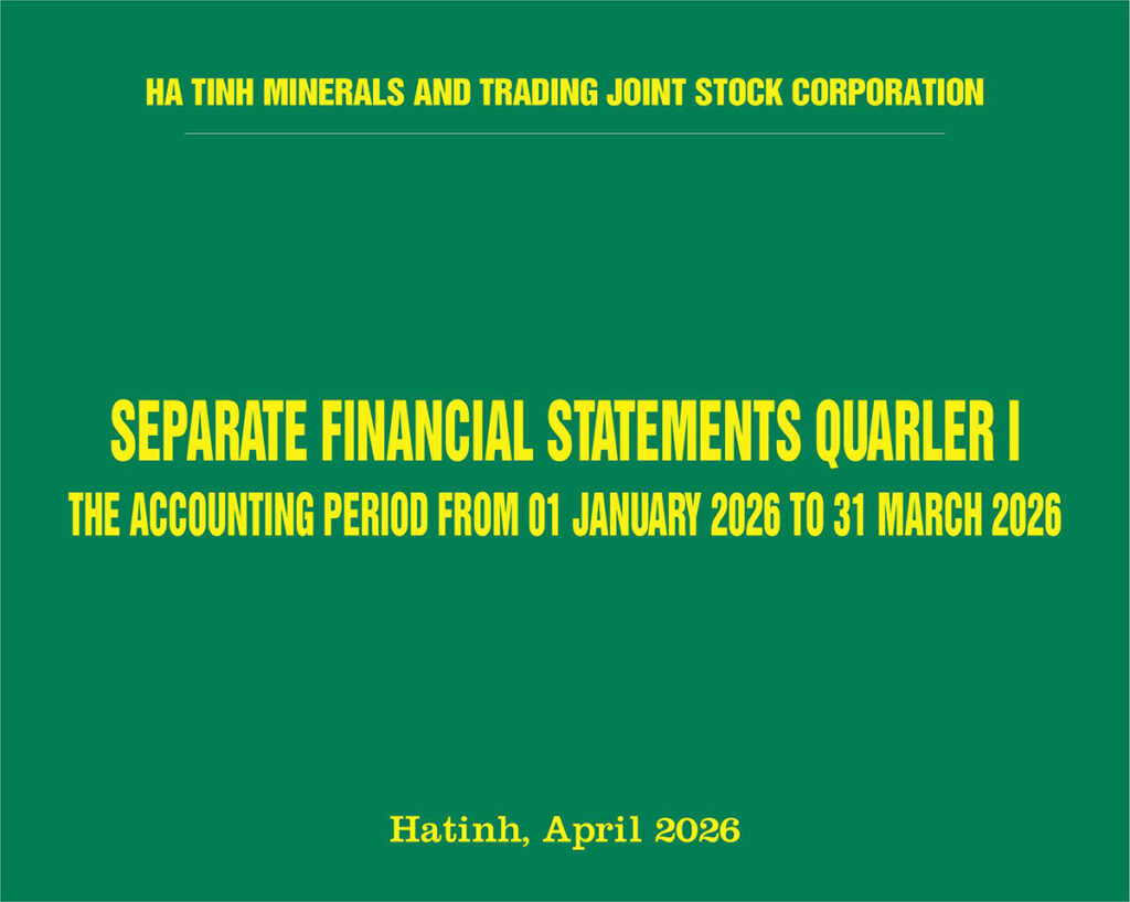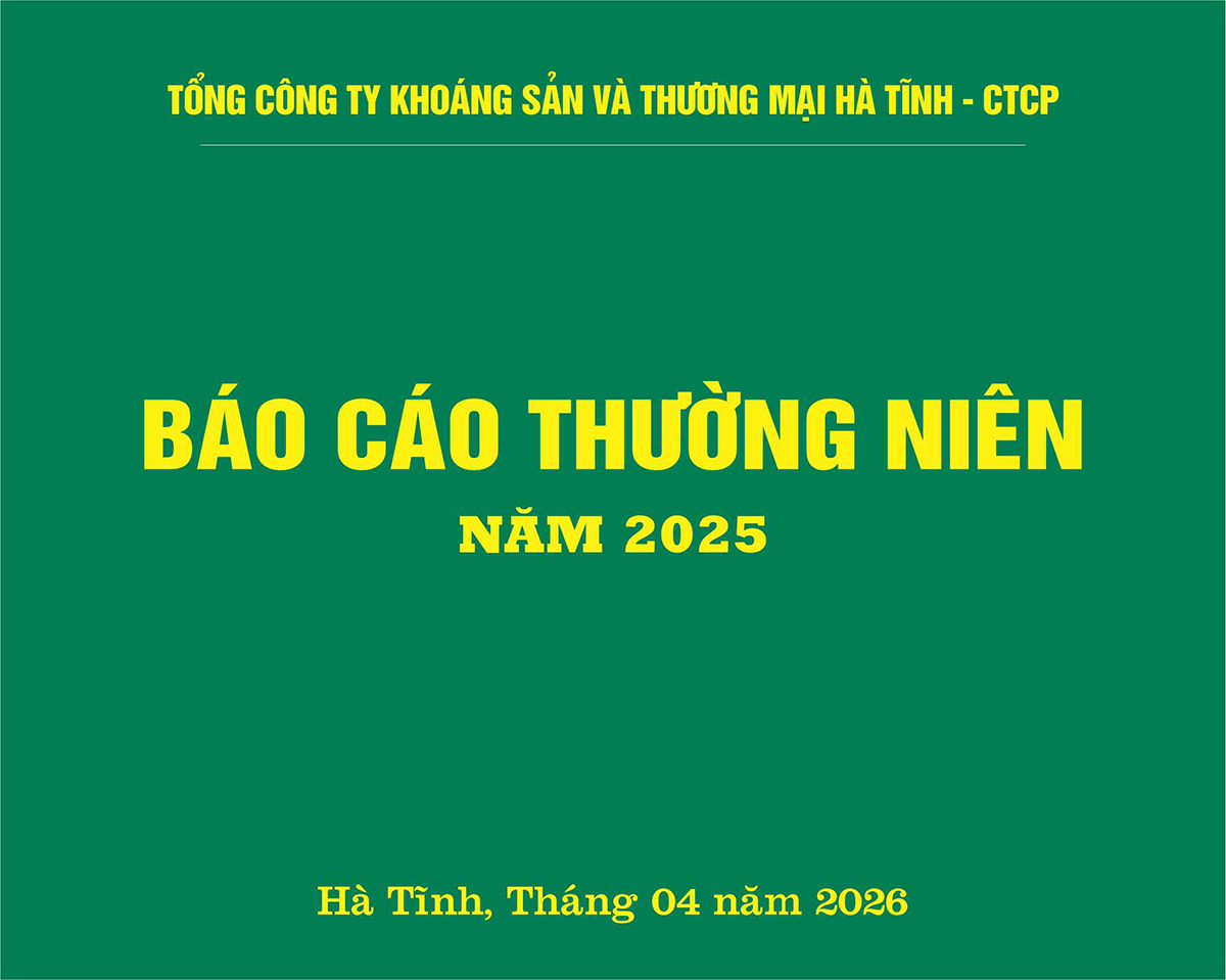 Báo cáo thường niên năm 2025 admin 17/04/26 Quan Hệ Cổ Đông, Báo Cáo Thường Niên 0 Posted on 17/04/2026 by adminBáo cáo thường niên năm 2025 Xem thêm: Doanh nghiệp, ruộng đồng khí thế khai xuân Báo cáo tài chính quý 3 năm 2024 Tháo gỡ khó khăn cho doanh nghiệp titan Việt Nam Giải trình kết quả kinh doanh quý 3 năm 2025 thay đổi hơn 10% so với cùng kỳ năm trước Báo cáo tài chính hợp nhất quý 1 năm 2015Bài viết cùng chủ đề: Regarding the last registration date to exercise the right to attend the 2026 annual general meeting of ha tinh minerals and trading joint stock corporation Thông báo về ngày đăng ký cuối cùng để thực hiện quyền tham dự Đại hội đồng cổ đông thường niên năm 2026 Resolution regarding the extension of the 2026 annual general meeting of shareholders of Ha tinh Minerals and Trading joint stock corporation Nghị quyết về việc gia hạn Đại hội đồng cổ đông thường niên Tổng công ty năm 2026 REGARDING THE EXPLANATION OF THE AUDITED BUSINESS RESULTS FOR 2025 CHANGING BY MORE THAN 10% YEAR OVER YEAR. Giải trình kết quả kinh doanh sau kiểm toán năm 2025 thay đổi hơn 10% so với cùng kỳ năm trước sau kiểm toán AUDITED CONSOLIDATED FINANCIAL STATEMENTS FOR THE FINANCIAL YEAR ENDED 31 DECEMBER 2025 AUDITED SEPARATE FINANCIAL STATEMENTS FOR THE FINANCIAL YEAR ENDED 31 DECEMBER 2025 Báo cáo tài chính hợp nhất cho năm tài chính kết thúc ngày 31/12/2025 Báo cáo tài chính riêng đã được soát xét cho năm tài chính kết thúc ngày 31/12/2025 Financial statements for the period from 01 january 2025 to 31 december 2025 Consolidated financial statements 4th quarter for the period from 01 january 2025 to 31 december 2025 Báo cáo tài chính cho kỳ kế toán từ ngày 01/01/2025 đến ngày 31/12/2025 Giải trình kết quả kinh doanh quý 4.2025 và năm 2025 thay đổi hơn 10% so với cùng kỳ năm trước Báo cáo tài chính hợp nhất quý IV cho kỳ kế toán từ ngày 01/01/2025 đến ngày 31/12/2025 LIST OF STATE SHAREHOLDERS AND MAJORITY SHAREHOLDERS Regarding the last registration date to exercise the right to attend the 2026 annual general meeting of ha tinh minerals and trading joint stock corporation