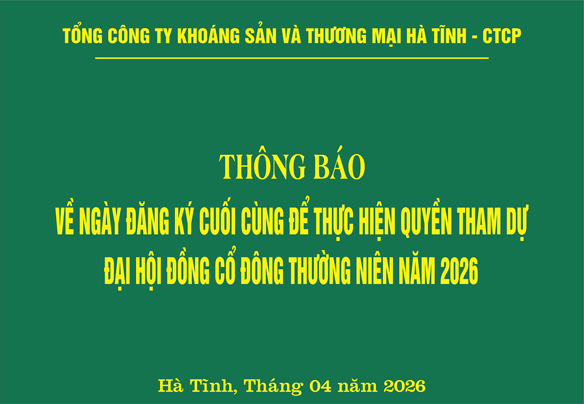 Thông báo về ngày đăng ký cuối cùng để thực hiện quyền tham dự Đại hội đồng cổ đông thường niên năm 2026 admin 14/04/26 Quan Hệ Cổ Đông, Đại Hội Đồng Cổ Đông Thường Niên, Thông Tin Cho Cổ Đông 0 Posted on 14/04/2026 by adminThông báo về ngày đăng ký cuối cùng để thực hiện quyền tham dự Đại hội đồng cổ đông thường niên năm 2026 Xem thêm: Báo cáo tài chính riêng đã được soát xét cho năm tài chính kết thúc ngày 31/12/2025 Đánh giá đúng thực lực Mitraco Hà Tĩnh để có giải pháp chiến lược trong phát triển Nhà cho công nhân và người lao động thuê tại Vũng Áng Báo cáo tài chính đã được kiểm toán năm 2016 Thông báo tuyển dụng tháng 5/2015Bài viết cùng chủ đề: Regarding the last registration date to exercise the right to attend the 2026 annual general meeting of ha tinh minerals and trading joint stock corporation Resolution regarding the extension of the 2026 annual general meeting of shareholders of Ha tinh Minerals and Trading joint stock corporation Nghị quyết về việc gia hạn Đại hội đồng cổ đông thường niên Tổng công ty năm 2026 REGARDING THE EXPLANATION OF THE AUDITED BUSINESS RESULTS FOR 2025 CHANGING BY MORE THAN 10% YEAR OVER YEAR. Giải trình kết quả kinh doanh sau kiểm toán năm 2025 thay đổi hơn 10% so với cùng kỳ năm trước sau kiểm toán AUDITED CONSOLIDATED FINANCIAL STATEMENTS FOR THE FINANCIAL YEAR ENDED 31 DECEMBER 2025 AUDITED SEPARATE FINANCIAL STATEMENTS FOR THE FINANCIAL YEAR ENDED 31 DECEMBER 2025 Báo cáo tài chính hợp nhất cho năm tài chính kết thúc ngày 31/12/2025 Báo cáo tài chính riêng đã được soát xét cho năm tài chính kết thúc ngày 31/12/2025 Financial statements for the period from 01 january 2025 to 31 december 2025 Consolidated financial statements 4th quarter for the period from 01 january 2025 to 31 december 2025 Báo cáo tài chính cho kỳ kế toán từ ngày 01/01/2025 đến ngày 31/12/2025 Giải trình kết quả kinh doanh quý 4.2025 và năm 2025 thay đổi hơn 10% so với cùng kỳ năm trước Báo cáo tài chính hợp nhất quý IV cho kỳ kế toán từ ngày 01/01/2025 đến ngày 31/12/2025 LIST OF STATE SHAREHOLDERS AND MAJORITY SHAREHOLDERS REPORT ON CORPORATE GOVERNANCE 6 MONTHS 2025 Resolution regarding the extension of the 2026 annual general meeting of shareholders of Ha tinh Minerals and Trading joint stock corporationRegarding the last registration date to exercise the right to attend the 2026 annual general meeting of ha tinh minerals and trading joint stock corporation